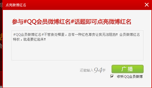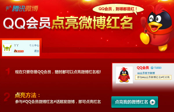 身为QQ会员,在哪里,都要闪亮登场,彰显红色尊贵,与众不同!亿万人之中,用红色来突显您的名字! QQ会员参与话题活动,即可点亮您的微博红名!赶紧行动吧QQ会员们!红名特权是QQ会员用户在互联网独一无二的身份标志,从QQ客户端,到,身为QQ会员,就要最红,最与众不同!