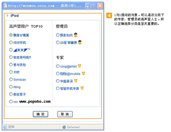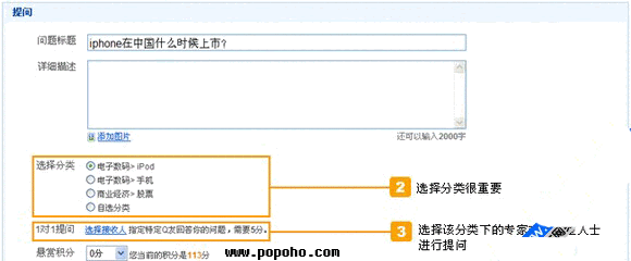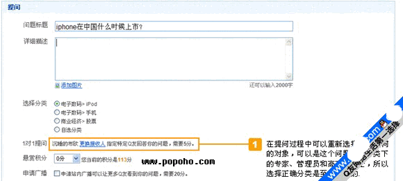 b) 在提问过程中可以重新选择1对1提问的对象,可以是这个问题所属分类下的专家、管理员和高声望人士,所以选择正确分类是至关重要的,成功提问后,您将更快的得到更专业的回答。