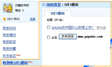 a) 当浏览一个用户的信息介绍页面时,觉得他可以回答您现在的疑问,怎么办呢?您可以直接点击头像下的“1对1提问”,直接提出您的问题,那么这个问题就会出现在该用户的个人中心的1对1提问列表中,可以更快的此人的回答 。