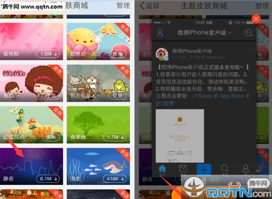 2、在主题皮肤商城中,我们可以看到名为“静夜”的主题,点击开始下载后,你的手机就会变为夜间模式,建议大家使用WIFI下载哦,不然会损失6M流量呢!