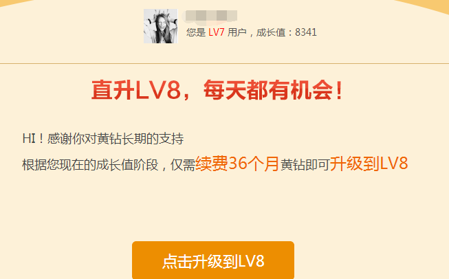 在活动页面登录QQ以后,即可看到系统自动提示你该一次性续费N个月黄钻即可直接升级到LV8,小编成长值太低,竟要续费36个月?!个人建议这个活动只有土豪才能够参与。