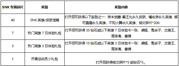 3个snk碎片可以兑换热门英雄3日体验礼包,三日体验礼包有机会获得15个钻石,还有虞姬,鬼谷子,等英雄的体验卡。