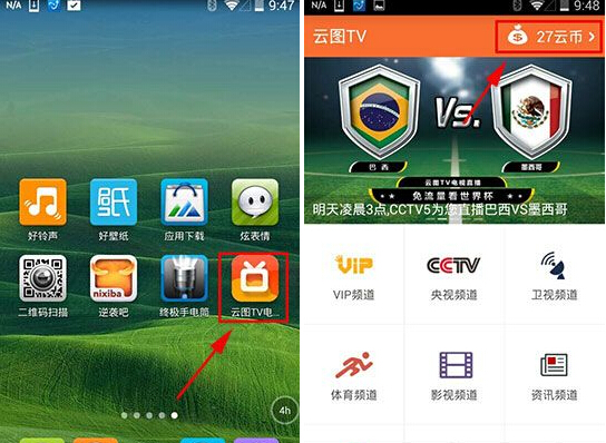 1、首先打开“云图TV”,然后在“频道”中的右上角的“云币”中点击进去。