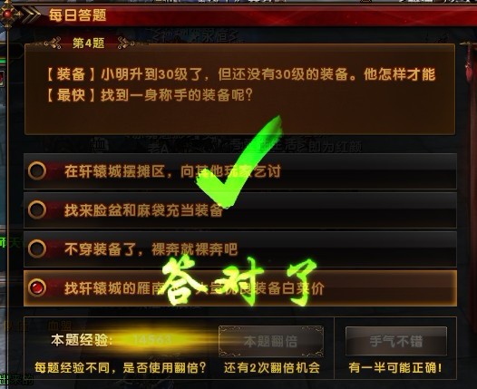 正确答案:找轩辕城的雁南飞,大量优良装备白菜价
