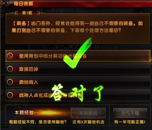 题目1:出门在外,经常会能一些自己不需要的装备。如果打到自己不需要的装备,下面哪个处理方法最好?