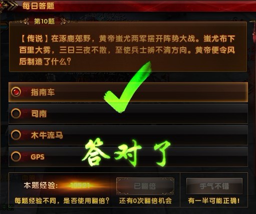 题目9:在涿鹿郊野,黄帝蚩尤两军摆开阵势大战。蚩尤布下百里大雾,三日三夜不散,至使兵士辨不清方向。黄帝便令风后制造了什么?