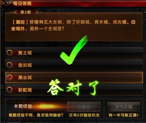 题目2:轩辕有五大主城,除了轩辕城、青木城、炎火城、白金城外,另外一个主城是?