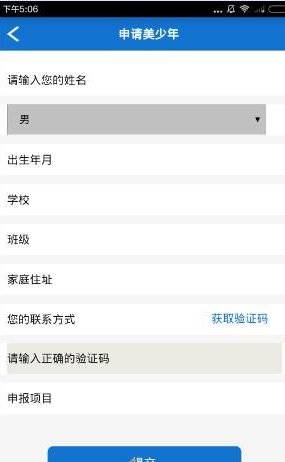 3、点击图中的报名申请按钮,输入姓名,性别,出生年月,学习,班级,家庭住址,联系凡是,验证码以及申报内容点击提交按钮就可以成功报名的哟~