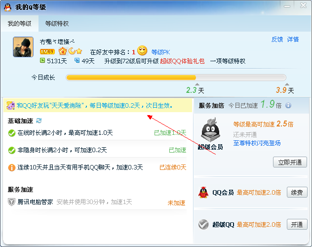 通过此方式加速累积的0.2个活跃天数,次日才会生效,届时您可以进入QQ客户端的“我的Q等级”界面查看。