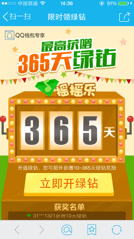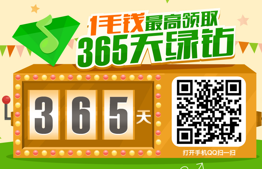 1、活动期间,您可打开手机QQ扫二维码进入手机页面参与活动。首次在QQ钱包绑定银行卡的用户,可享受支付0.1元即可随机领取15-365天绿钻,也就是说最低领取15天,最高领取365天绿钻。