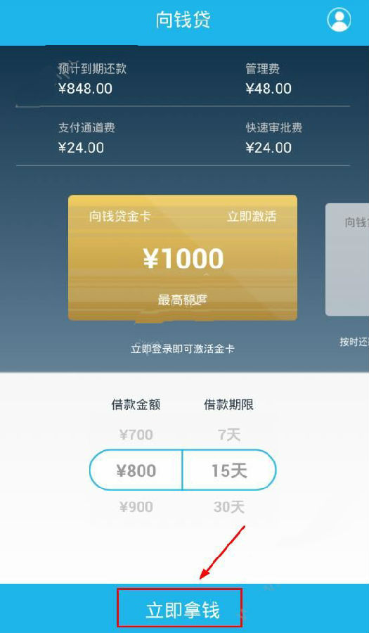 1、打开向钱贷APP,在首页选择借款金额和期限,然后点击快速拿钱进入到认证页面;
