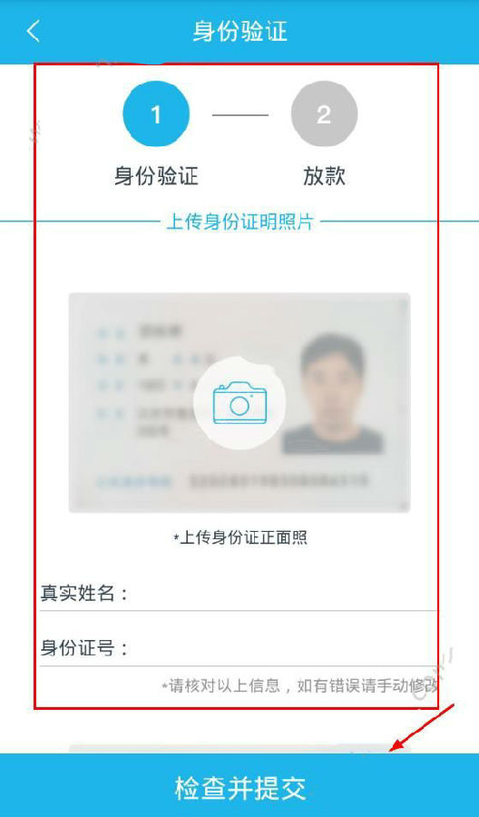 2、在身份验证码页面,用户上传身份证正反面照,输入真实的身份信息,同时完成人脸识别等认证,以及填写相关身份信息,然后点击检查交提交即可快速申请借款;