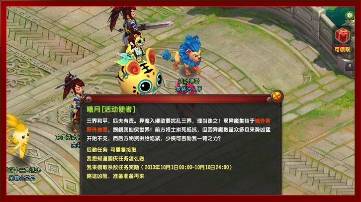 国庆活动一共包括后勤任务、杀敌任务、BOSS挑战3个子活动。完成任务不仅能获得大量经验与银票奖励,还有机会获得传说中的神兽哦!