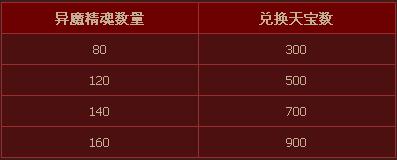 4、每次成功击杀异魔,除常规奖励外,还将获得道具:异魔精魂。当异魔精魂分别累积到80、120、140、160个时可以找曦月兑换天宝奖励(温馨提示:异魔精魂切记不要丢弃,否则无法兑换天宝),活动期间,最多可以兑换4次天宝奖励
