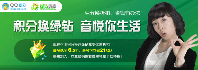 QQ积分换绿钻活动,音悦你生活,大家生活中所在QQ里消费的东西都是有积分的哦!使用积分换折扣,让你省钱办法。现在可用积分兑换QQ绿钻,可享受优惠折扣,最多低至6.5折,做多可以省21Q币哦!