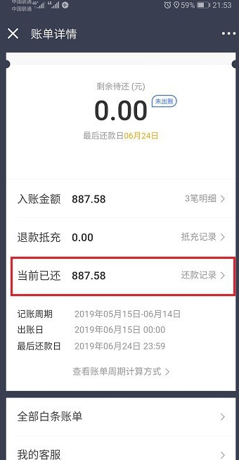 第三步在账单界面,可以看到当前已还的金额,点击还款记录,如下图所示: