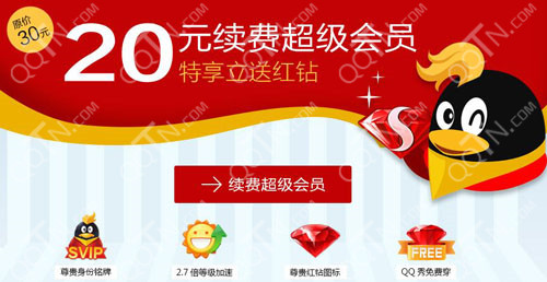 超级会员红钻联合活动再次登场,这个活动好像不间断的来一次,活动规则以及参与方式都是一样的,仅需支付20元开通超级会员即可将红钻抱回家!立省10元!并且还能够获得2.7倍加速以及全场QQ秀任意使用的特权,感兴趣的小伙伴们赶紧来参与吧!