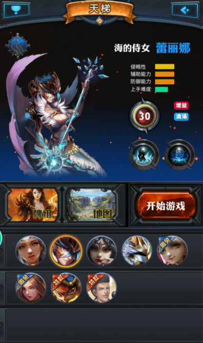 准备界面与练习模式一样,可选牌组、地图和英雄,长按英雄技能可查看说明,而左上角的奖杯是天梯赛的赛季排名