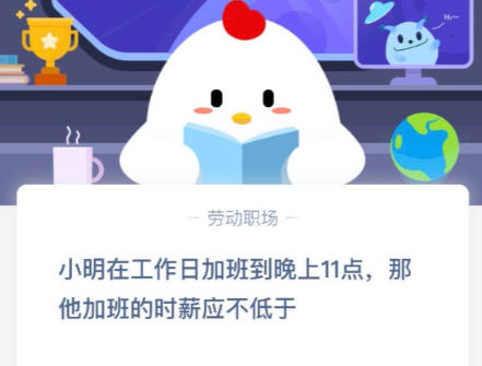 支付宝庄园小课堂4月12日的问题是,小明在工作日加班到晚上11点,那他加班的时薪应不低于平常时薪的多少倍呢?下文给出了正确答案。