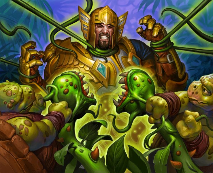 我们起手找银色侍从、正义保护者、恐狼先锋、飞刀杂耍者,迷失丛林可以和飞刀一起留。在对上快攻卡组可以留狂野炎术师;对上控场卡组时则可以留神恩术、通道爬行者。这套卡组的前期铺场能力很强,再配合恐狼或者污手以及未鉴定的重槌的buff,能给对手很大的压力。