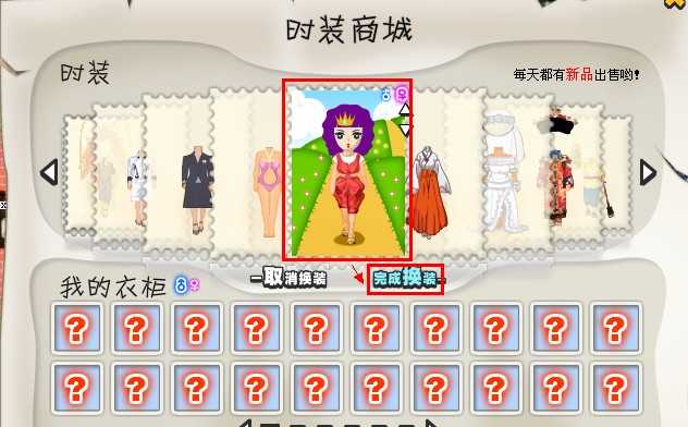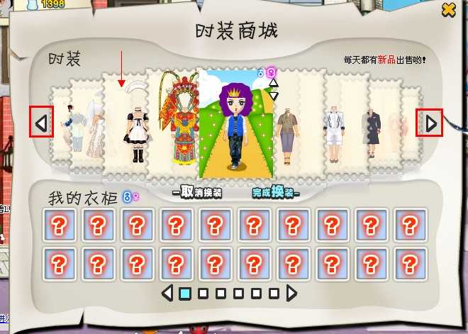二、在出现的时装商城页面中,点击左右两边的小三角或者服装图片进行选择;