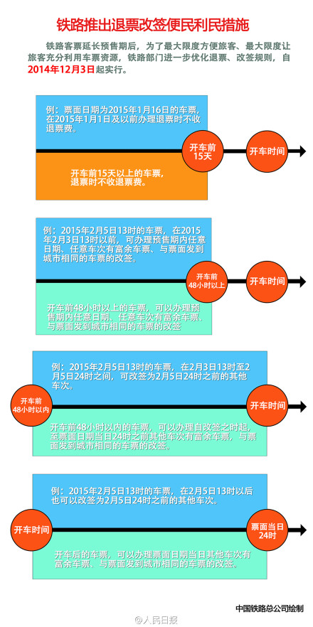 铁路客票延长预售期后,为了最大限度方便旅客、最大限度让旅客充分利用车票资源,中国铁路总公司决定进一步优化退票、改签规则,现公布如下,自2014年12月3日起施行。