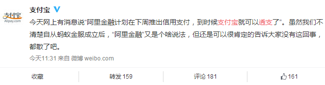 关于支付宝透支消费的信息官方已明确表明并不成立,而且支付宝母公司也否认了这一说法,蚂蚁金服工作人员表示:“网上流传的所谓 支付宝透支消费,推信用支付 ,其实已经是去年的旧闻了。我们再一次明确:蚂蚁金服没有推信用支付的计划。”