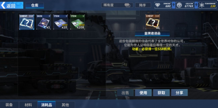 1、皇牌邀请函是一个消耗品,一般会通过官方活动赠送。2、使用皇牌邀请函必得一位SSR机师。3、获得皇牌邀请函后,进入仓库就能看到它。4、点击皇牌邀请函,选择使用,即可获得SSR机师。
