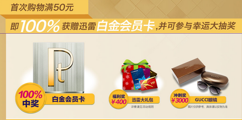 会员与唯品会联合活动,迅雷会员免费送,好礼等你拿!参与活动100%送迅雷会员,再赢GUCCI眼镜。扫描下载唯品会APP,注册登陆,即可免费获得迅雷会员,首次购物满50元,即100%获赠白金会员卡,并可