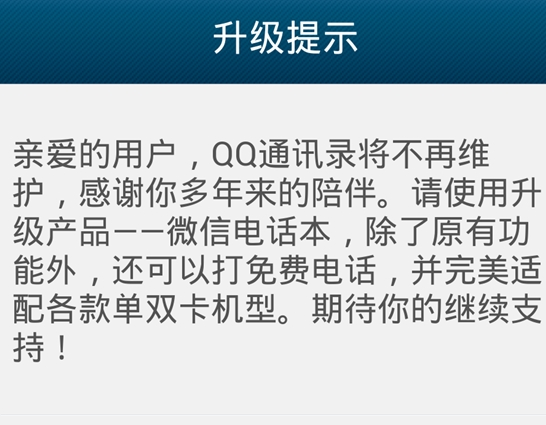当大家想要QQ通讯录时,会发现腾讯将不再维护该系统,想要继续享用通讯录的用户需下载,也就是说,腾讯强制推行微信电话本老吸引客户,实在是狠!微信电话本正式推出、带来所谓后,曾一度引发热议,不少业内人士认