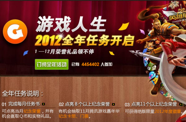 游戏人生2012年年度任务开启了!完成任务,即可领取荣誉点为30点的每月绝版纪念荣誉,更有机会赢取各游戏公仔、服饰、道具、腾讯游戏嘉年华卡册、门票,还能获取荣誉点为200点的绝版2012年度徽章(金)