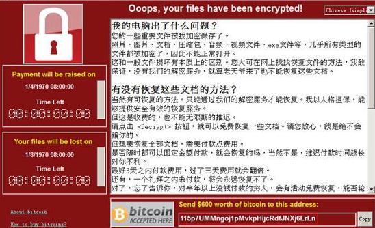“永恒之蓝”传播的勒索病毒以ONION和WNCRY两个家族为主,受害机器的磁盘文件会被篡改为相应的后缀,图片、文档、视频、包等各类资料都无法正常打开,只有支付赎金才能解密恢复。这两类勒索病毒,勒索金额分别是5个比特币和300美元,折合人民币分别为5万多元和2000多元。