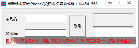 亮哥iPhoneQQ在线是一款用来卡iPhoneQQ在线的一款辅助软件,使用非常方便,只需输入QQ号码进行登录即可。本次版本是近期最新更新版本,将iphnoe协议进行了更新。保证可用,稳定不掉线!欢迎下载测试!