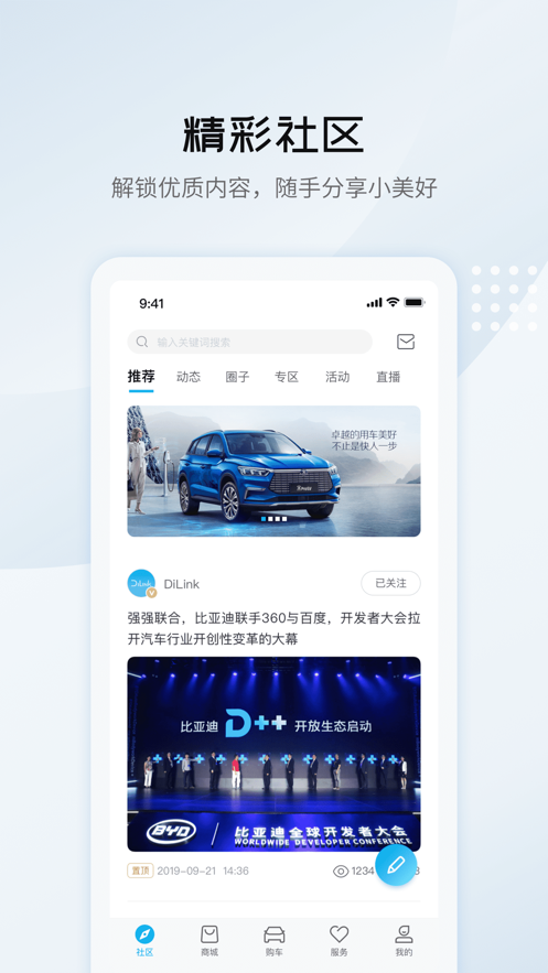 通过比亚迪汽车APP,为用户提供、活动资讯、车友互动、积分权益、寻桩救援等多项服务,给用户带来更加智能、便利、无忧的用车体验。