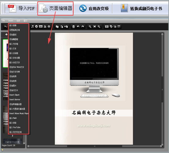 名编辑电子杂志大师是一款以PDF为源文件来制作具有震撼效果的flash电子杂志软件编辑系统。在使用名编辑电子杂志之前,您只需要导入PDF格式的杂志文件到名编辑软件系统内,便可以进行编辑,设计PDF杂志内容,制作精美的电子杂志。嵌入超链接,添加声音,视频,图片等多媒体文件。制作精美网络电子杂志,完全不需要任何的编程技术。简单、方便、易使用!
