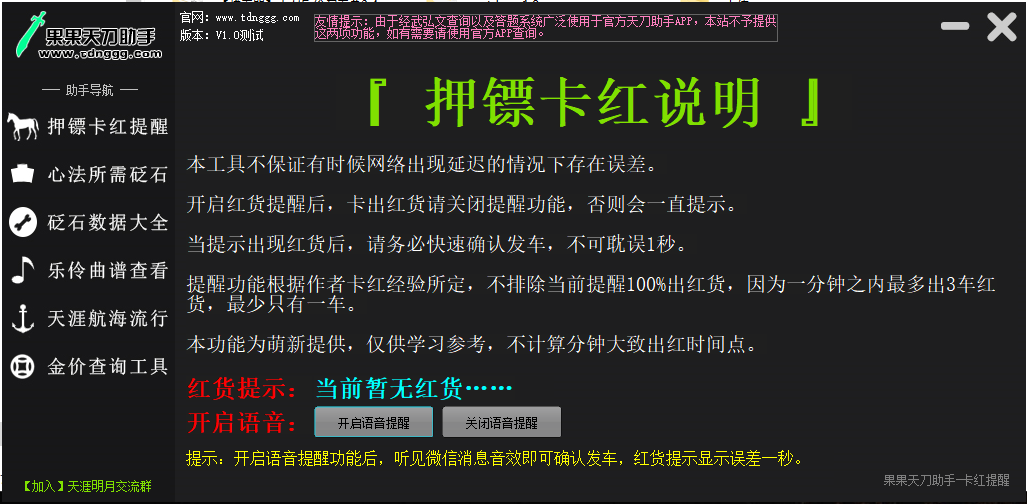果果天刀助手是一个盒子的工具,但是其中的功能更加厉害能查询当前大区金价,能够押镖出红时间,整点还是05,还能是实时查询航海信息,有需要的玩家不要错过了,欢迎下载使用!