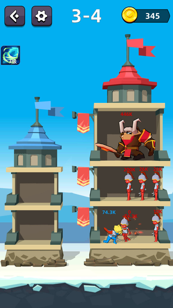 左边的蓝色城堡是我方阵营,右边的红色城堡代表的是敌方阵营,每一关卡分为四个小关卡,逐个通过每个小关卡才算挑战成功哦。