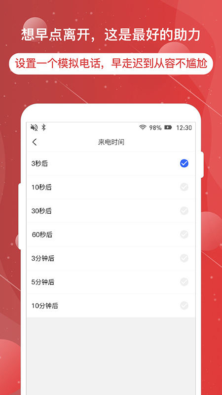 软件可以提前设置录音对话,软件内集成了市面所有主流手机的来电屏显界面。可用来在您的手机上模拟一个打进来电话的事件,可以设置来电人的信息以及来电话的时间。帮助您更体贴、更礼貌、更绅士的寻找借口以离开您不愿参与的活动。
