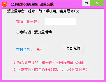 2、主页面如下图,输入手机号码,选择参与领6G参与爱流量活动,点击立即充值即可
