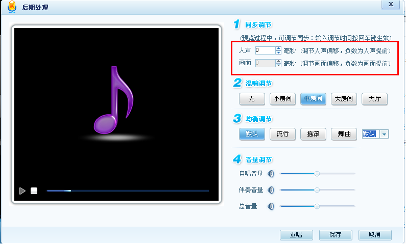 在录制完成后期处理的时候有调节自唱速度以及画面播放速度的功能,您先停止试听的歌曲,然后在调节框内填入需要修正的时间,最大可调节±3000毫秒。