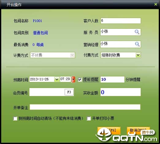 (4) 支持开单时确定预计消费时间、费用,直接刷会员卡结账,消费到时间后根据设置可以自动清场;