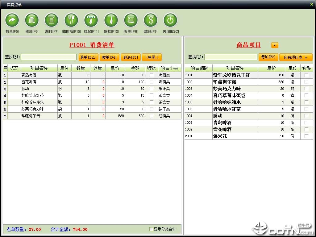 (4) 赠单:对宾客消费的指定商品免费赠送时,直接点赠单操作即可;