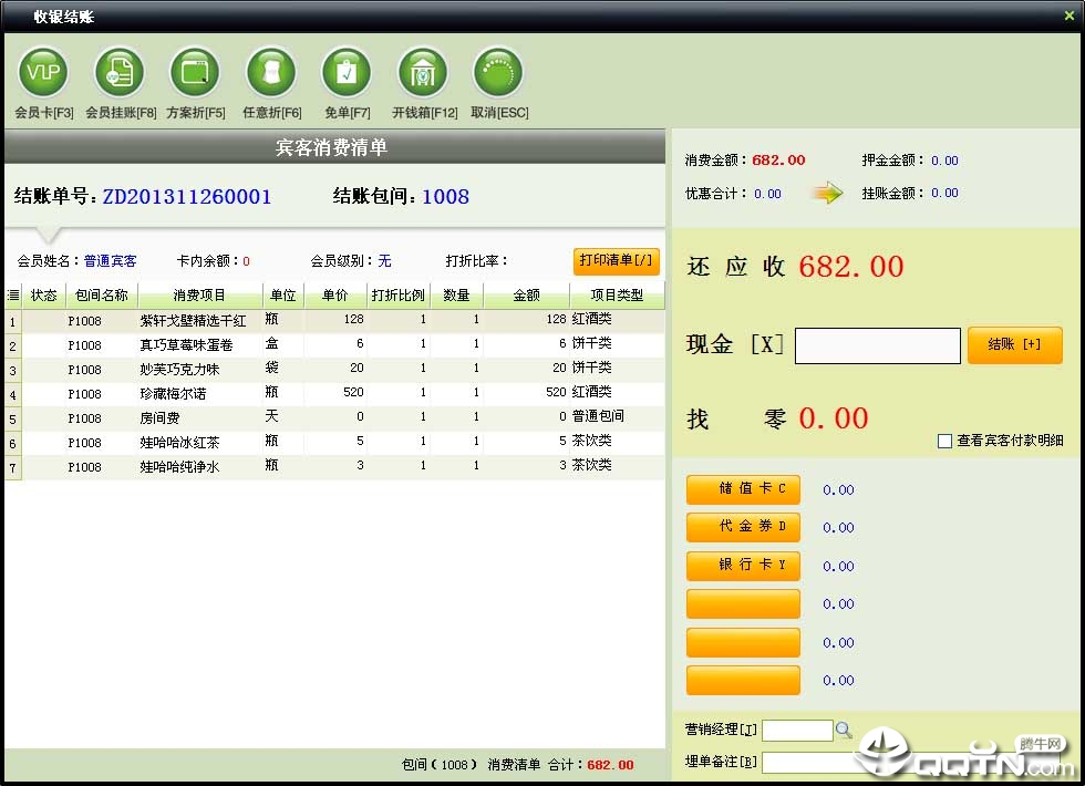 (1) 直接输入宾客支付的现金金额结账,如果宾客同时用储值卡或代金券等其它付款方式结账时,直接点击相应的付款方式按钮即可;