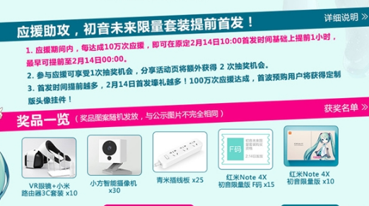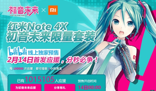 今日,小米官方宣布,B站应援红米Note 4X初音未来限量套装的用户已经超过100万人。每达成10万次应援,可在原定2月14日10:00首发时间基础上提前1小时。目前,发售时间已经提前到2月14日情人节0O:00。