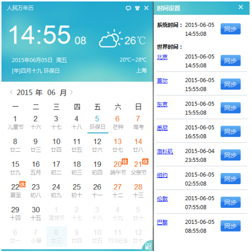 人民是一款绿色简洁、界面美观大方的日历万年历软件,它为用户提供天气预报、公农历对应、假日节气查询、放假安排查询等生活功能,另外还支持自由换肤,界面不仅美观时尚,而且操作起来非常简单,小巧不占用系统资源,是一款非常不错的电脑日历软件。