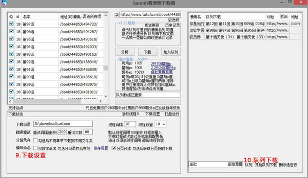 10.队列下载,可以把待下载选好的漫画分析,然后勾选需要下载的章节后,点击队列-加入队列,即可出现在右侧队列下载栏里,重启软件后依然有效,点击开始队列下载,即可从上往下进行任务的依次下载,完成章节或漫画后都会更新队列状态,比如《你是我的老师》漫画1-12话在队列中,进行队列下载,第1话下载完成后将更新队列为2-12话。这部漫画队列下载后将进行下部漫画的队列下载。