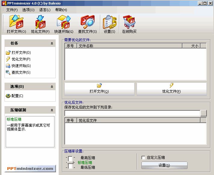 PPTminimizer是一个PPT文档压缩工具,能够通过其智能压缩技术,显著地减少PowerPoint演示文档的大小。其实除了PPT之外,该软件也可用于压缩Word文档,效果也很不错。