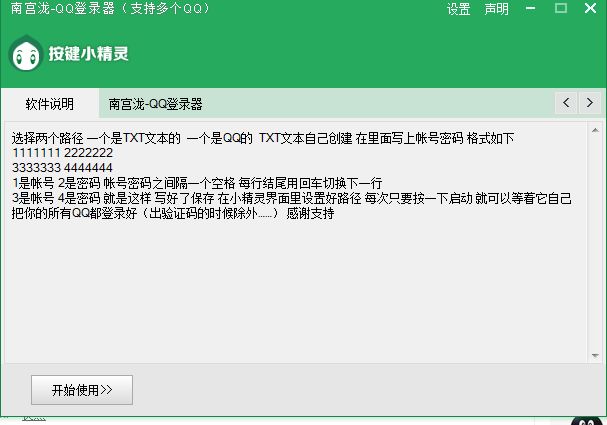 南宫泷QQ登录器是最新的QQ账号批量登录器,软件通过读取txt文本自动登录QQ号,支持多个QQ同时登录,非常适合工作室或者个人小号使用,软件操作简单,绿色无毒,请放心使用。