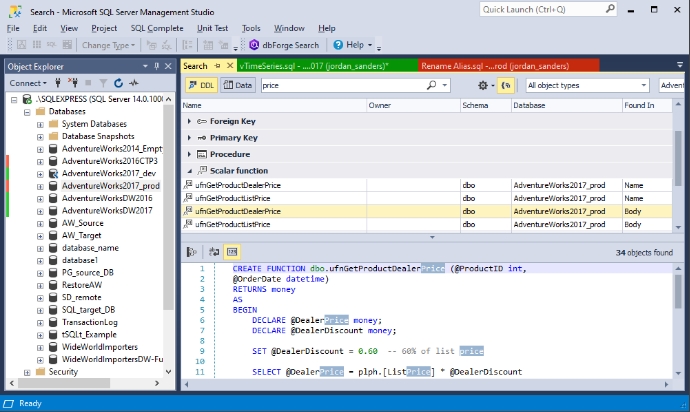 dbForge Search是SQL Server数据库开发人员的免费工具,它允许在数据库中搜索SQL对象,数据和文本。当数据库包含许多对象时,通常很难找到所需的表或记住存储的例程的名称。使用它,您不再需要手动遍历整个数据库模式来在存储过程中查找所需的列名或特定文本。