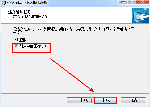请选择在安装 vivo手机驱动 期间安装向导要执行的附加任务,然后点击“下一步”。